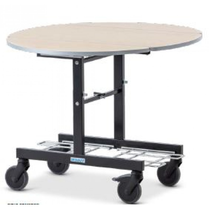 Stahlrohr-Konstruktion mit ovaler Tischplatte in Holz-Dekor mit wiederstandsfähiger, abdichtender Kante und nach unten abklappbaren Seitenteilen, 2 klappbaren verchromten Ablagen für die Hot-Box, für Lagerung und Transport sind die Tischplatten senkrecht arretierbar und der RSCV-Comfort platzsparend ineinanderschiebbar, berfläche: Kunststoff-Pulver-beschichtet in Tiefschwarz Rollen: 4 Lenkrollen, davon 2 mit Feststellern, Gummi-Laufflächen Produkt: Wanzl
